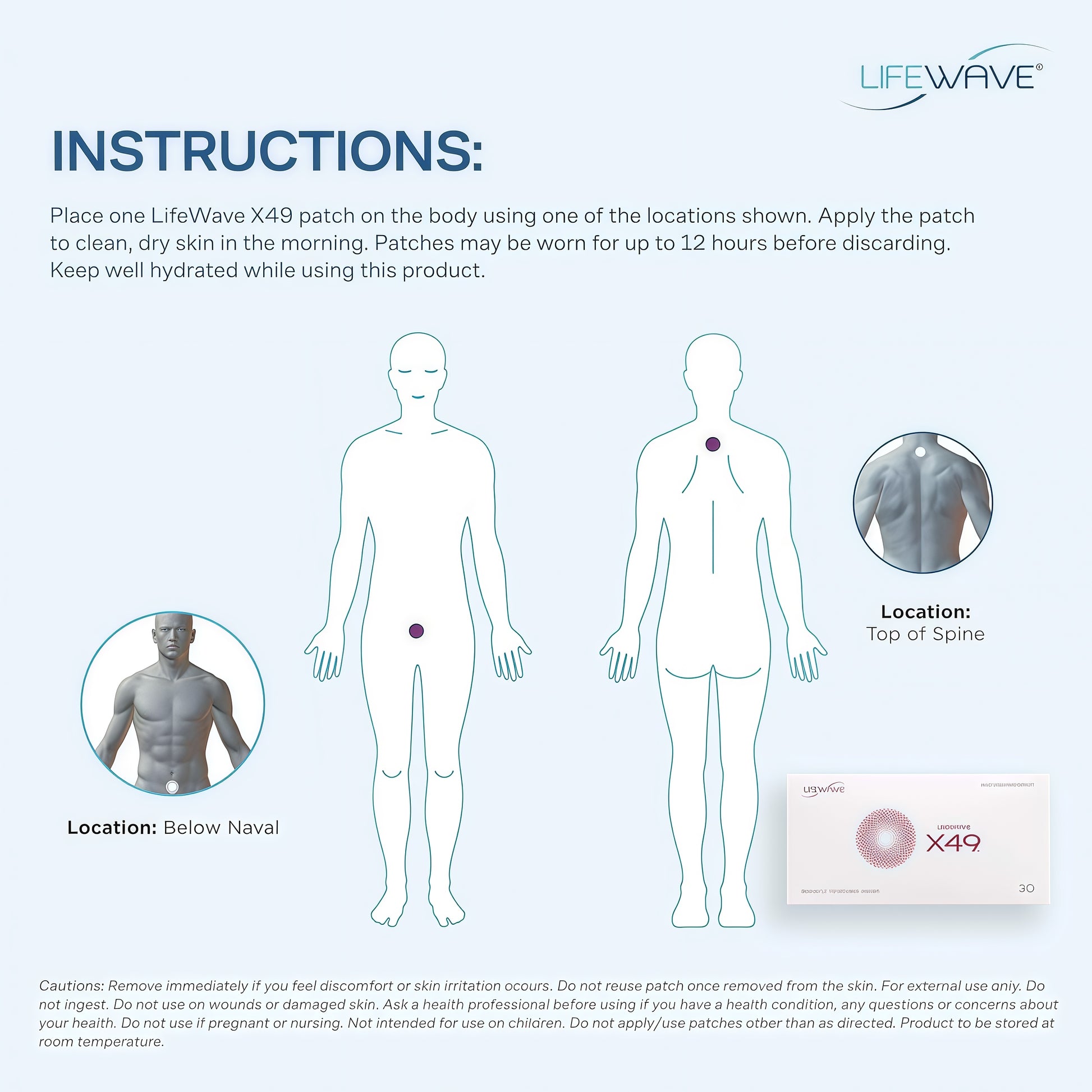 Place one LifeWave X49 patch on the body, using one of the locations shown. Apply the patch to clean, dry skin in the morning. Patches may be worn for up to 12 hours before discarding. Keep well hydrated while using this product.